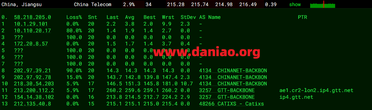 8   202.97.99.65    AS4134   [CHINANET-BB]    中国 北京   www.chinatelecom.com.cn