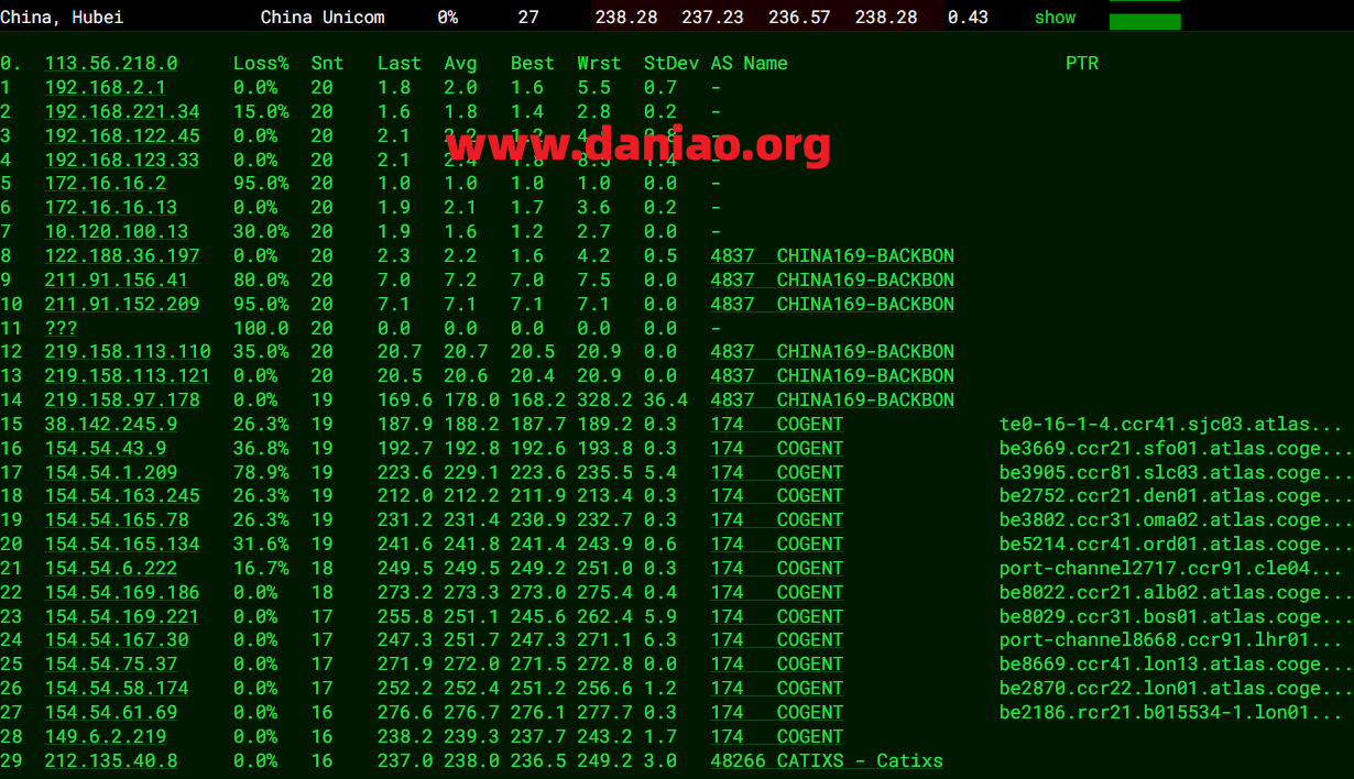 联通去程:联通骨干直连美西圣何塞之后接驳cogent去往美东,最后从美东波士顿直连到英国~