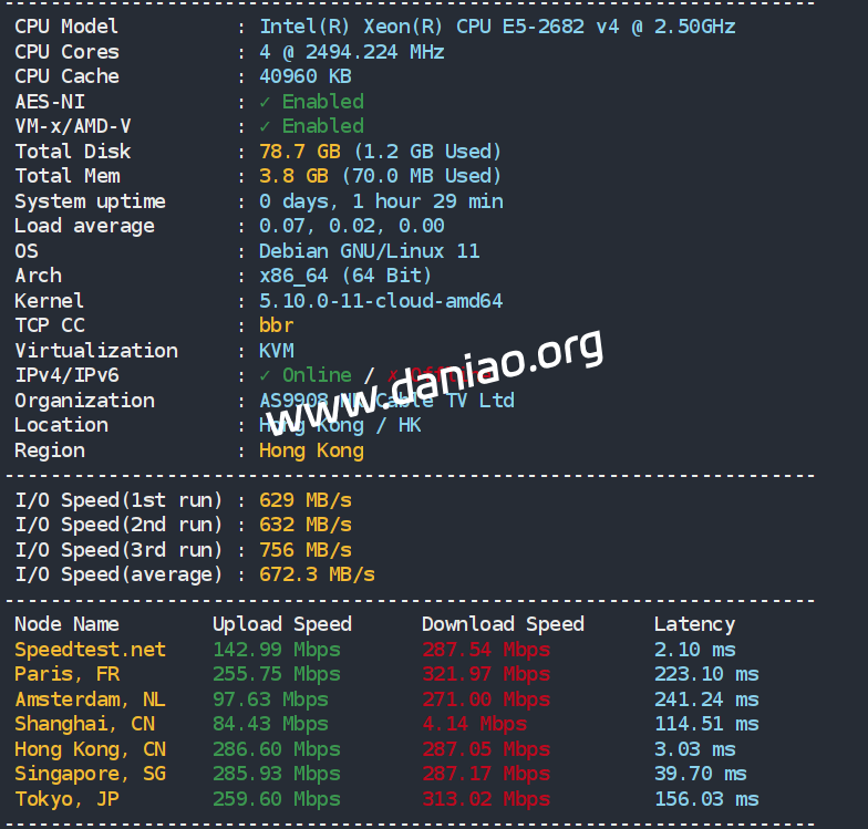 CPU E5-2682 v4 @ 2.50GHz,磁盘io当前测试 672.3 MB/s,上游AS9908 HK Cable TV Ltd,不支持IPv6