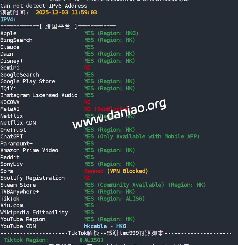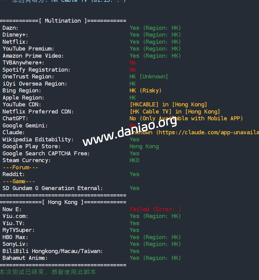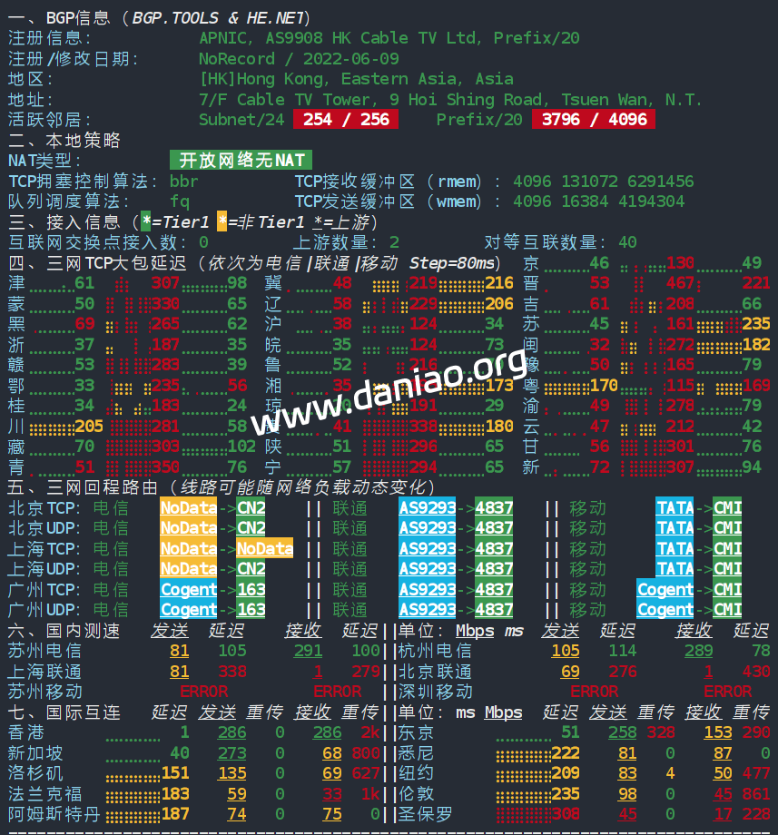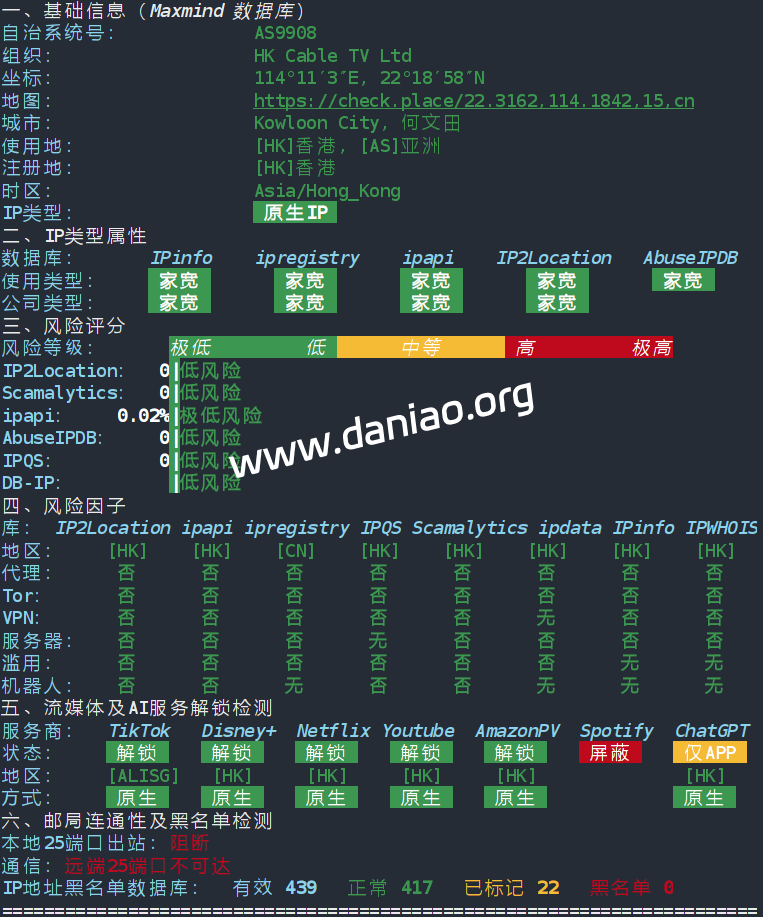 IP为上游AS9908 HK Cable TV Ltd也就是香港有线宽屏iCable提供,IP纯净度很好,具有双ISP属性,解锁能力也很强。