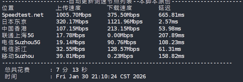 CPU Model : AMD EPYC 7443P 24-Core Processor CPU Cores : 1 @ 2844.654 MHz CPU Cache : 512 KB AES-NI : ✓ Enabled VM-x/AMD-V : ✗ Disabled Total Disk : 40.3 GB (12.1 GB Used) Total Mem : 1.9 GB (883.6 MB Used) Total Swap : 1024.0 MB (0 Used) System uptime : 79 days, 6 hour 2 min Load average : 0.18, 0.53, 1.03 OS : Debian GNU/Linux 12 Arch : x86_64 (64 Bit) Kernel : 6.1.0-38-amd64 TCP CC : bbr Virtualization : KVM IPv4/IPv6 : ✓ Online / ✓ Online Organization : AS906 DMIT Cloud Services Location : Tokyo / JP Region : Tokyo ---------------------------------------------------------------------- I/O Speed(1st run) : 370 MB/s I/O Speed(2nd run) : 432 MB/s I/O Speed(3rd run) : 413 MB/s I/O Speed(average) : 405.0 MB/s ---------------------------------------------------------------------- Node Name Upload Speed Download Speed Latency Paris, FR 1269.03 Mbps 874.26 Mbps 218.88 ms Hong Kong, CN 4.20 Mbps 5.22 Mbps 45.22 ms Tokyo, JP 2085.66 Mbps 1974.27 Mbps 1.07 ms ----------------------------------------------------------------------