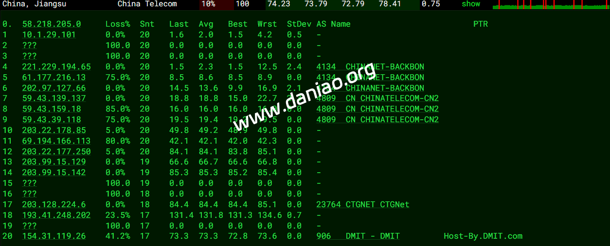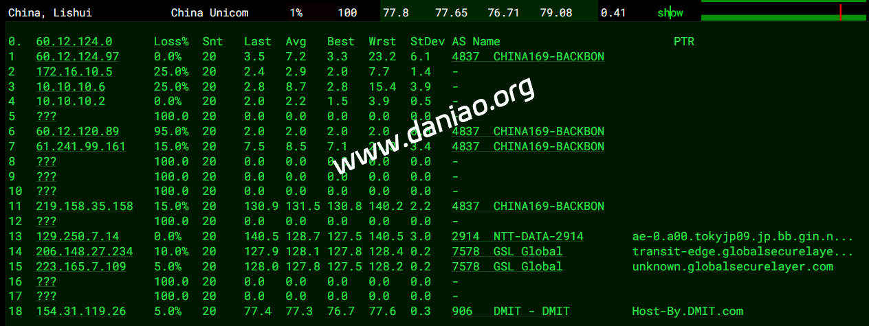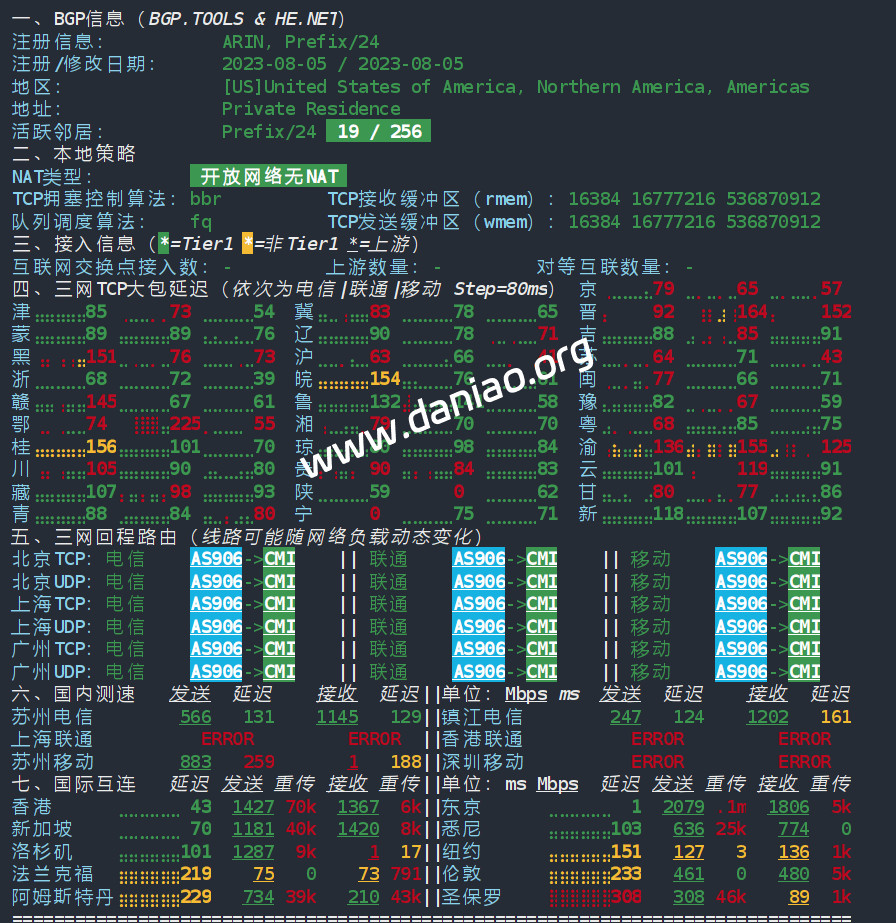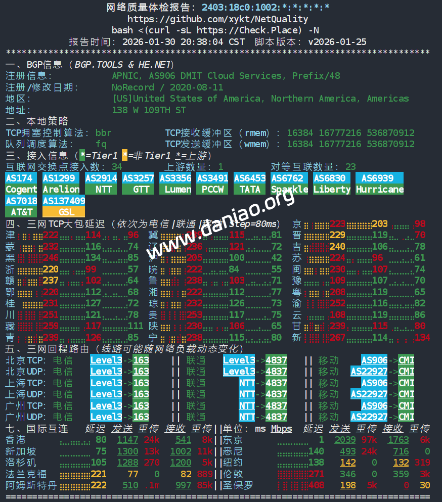 北京 电信 Level3 -> 163 地理路径:日本 -> 香港 -> 美国 -> 北京 自治系统路径:AS906 -> AS9002 -> AS3356 -> AS4134 -> AS23724 1-3 0.53ms 2403:18c0:1003:*:*:*:*:* AS906 日本 东京都 东京 DMIT.com 4 43.83ms 2a02:2d8::*:*:*:*:* AS9002 中国 香港 retn.net 5 45.12ms 2001:1900:2100:*:*:*:*:* AS3356 中国 香港 lumen.com 6 152.18ms 2001:1900::*:*:*:*:* AS3356 美国 加利福尼亚 圣何塞 Level3-CT-PoP lumen.com 8-9 225.93ms 240e:0:a:*:*:*:*:* AS4134 中国 北京 chinatelecom.com.cn 电信 11-13 236.83ms 240e:0:9000:*:*:*:*:* AS23724 中国 北京市 bjtelecom.net 电信 15 236.57ms 240e:904:800:*:*:*:*:* AS23724 中国 北京市 bjtelecom.net 电信 北京 联通 Level3 -> 4837 地理路径:日本 -> 香港 -> 北京 自治系统路径:AS906 -> AS9002 -> AS3356 -> AS4837 -> AS4808 1-3 0.70ms 2403:18c0:1003:*:*:*:*:* AS906 日本 东京都 东京 DMIT.com 4 44.28ms 2a02:2d8::*:*:*:*:* AS9002 中国 香港 retn.net 5 44.30ms 2001:1900:2100:*:*:*:*:* AS3356 中国 香港 lumen.com 8-9 198.69ms 2408:8000:2:*:*:*:*:* AS4837 中国 北京 chinaunicom.cn 联通 11-12 198.26ms 2408:8000:1100:*:*:*:*:* AS4808 中国 北京 www.bbn.com.cn 联通 14 195.74ms 2408:8706:0:*:*:*:*:* AS4808 中国 北京市 www.bbn.com.cn 联通 北京 移动 AS906 -> CMI 地理路径:日本 -> 香港 -> 广东 -> 北京 自治系统路径:AS906 -> AS58453 -> AS9808 1-3 0.82ms 2403:18c0:1003:*:*:*:*:* AS906 日本 东京都 东京 DMIT.com 4 1.64ms 2402:4f00:100:*:*:*:*:* AS58453 日本 东京都 东京 cmi.chinamobile.com 移动 5 56.06ms 2402:4f00:100:*:*:*:*:* AS58453 中国 香港 cmi.chinamobile.com 6-8 55.57ms 2409:8080:0:*:*:*:*:* AS9808 中国 广东 广州 chinamobileltd.com 移动 9-12 89.94ms 2409:8080:0:*:*:*:*:* AS9808 中国 北京市 chinamobileltd.com 移动 13 105.09ms 2409:8c00:7821:*:*:*:*:* AS9808 中国 北京市 chinamobileltd.com 移动 上海 电信 Level3 -> 163 地理路径:日本 -> 香港 -> 美国 -> 上海 自治系统路径:AS906 -> AS9002 -> AS3356 -> AS4134 -> AS4812 1-3 0.58ms 2403:18c0:1003:*:*:*:*:* AS906 日本 东京都 东京 DMIT.com 4 44.01ms 2a02:2d8::*:*:*:*:* AS9002 中国 香港 retn.net 5 44.90ms 2001:1900:2100:*:*:*:*:* AS3356 中国 香港 lumen.com 6 152.41ms 2001:1900::*:*:*:*:* AS3356 美国 加利福尼亚 圣何塞 Level3-CT-PoP lumen.com 8-9 201.57ms 240e:0:a:*:*:*:*:* AS4134 中国 上海 chinatelecom.com.cn 电信 11-13 204.55ms 240e:18:10:*:*:*:*:* AS4812 中国 上海 chinatelecom.cn 15 203.16ms 240e:96c:6000:*:*:*:*:* AS4812 中国 上海市 chinatelecom.cn 电信 上海 联通 NTT -> 4837 地理路径:日本 -> 上海 -> 江苏 自治系统路径:AS906 -> AS7578 -> AS2914 -> AS4837 1-2 0.76ms 2403:18c0:1003:*:*:*:*:* AS906 日本 东京都 东京 DMIT.com 3 0.61ms 2401:3cc0::*:*:*:*:* AS7578 日本 东京都 东京 globalsecurelayer.com 4 0.81ms 2001:218:3000:*:*:*:*:* AS2914 日本 东京都 东京 gin.ntt.net 6-7 8.93ms 2001:218:0:*:*:*:*:* AS2914 日本 大阪府 大阪 gin.ntt.net 8 89.85ms 2001:218:0:*:*:*:*:* AS2914 日本 gin.ntt.net 9-10 89.76ms 2408:8000:2:*:*:*:*:* AS4837 中国 上海 chinaunicom.cn 联通 11-13 96.71ms 2408:8000:2:*:*:*:*:* AS4837 中国 江苏 南京 上海-江苏 chinaunicom.cn 联通 15 94.39ms 2408:873c:6810:*:*:*:*:* AS4837 中国 江苏省 泰州市 chinaunicom.cn 联通 上海 移动 AS906 -> CMI 地理路径:日本 -> 上海 自治系统路径:AS906 -> AS58453 -> AS9808 1-2 0.70ms 2403:18c0:1003:*:*:*:*:* AS906 日本 东京都 东京 DMIT.com 4 3.86ms 2402:4f00:100:*:*:*:*:* AS58453 日本 东京都 东京 cmi.chinamobile.com 6-10 33.59ms 2409:8080:0:*:*:*:*:* AS9808 中国 上海 chinamobileltd.com 移动 13 35.42ms 2409:8c1e:68e0:*:*:*:*:* AS9808 中国 上海市 chinamobileltd.com 移动 广东 电信 Level3 -> 163 地理路径:日本 -> 香港 -> 美国 -> 广东 自治系统路径:AS906 -> AS9002 -> AS3356 -> AS4134 -> AS4816 1-3 3.52ms 2403:18c0:1003:*:*:*:*:* AS906 日本 东京都 东京 DMIT.com 4 44.03ms 2a02:2d8::*:*:*:*:* AS9002 中国 香港 retn.net 5 44.37ms 2001:1900:2100:*:*:*:*:* AS3356 中国 香港 lumen.com 6 153.79ms 2001:1900::*:*:*:*:* AS3356 美国 加利福尼亚 圣何塞 Level3-CT-PoP lumen.com 8 200.25ms 240e:0:a:*:*:*:*:* AS4134 中国 广东 广州 chinatelecom.com.cn 电信 9 203.83ms 240e:0:a:*:*:*:*:* AS4134 中国 chinatelecom.com.cn 电信 11-12 209.31ms 240e:1f:6000:*:*:*:*:* AS4816 中国 广东 深圳 电信 15 213.85ms 240e:97c:4008:*:*:*:*:* AS4816 中国 广东省 深圳市 电信 广东 联通 NTT -> 4837 地理路径:日本 -> 上海 -> 广东 自治系统路径:AS906 -> AS7578 -> AS2914 -> AS4837 -> AS135061 -> AS17623 -> AS135061 1-2 1.54ms 2403:18c0:1003:*:*:*:*:* AS906 日本 东京都 东京 DMIT.com 3 1.04ms 2401:3cc0::*:*:*:*:* AS7578 日本 东京都 东京 globalsecurelayer.com 4-5 3.98ms 2001:218:3000:*:*:*:*:* AS2914 日本 东京都 东京 gin.ntt.net 6-7 9.14ms 2001:218:0:*:*:*:*:* AS2914 日本 大阪府 大阪 gin.ntt.net 8 89.53ms 2001:218:0:*:*:*:*:* AS2914 日本 gin.ntt.net 9 90.79ms 2408:8000:2:*:*:*:*:* AS4837 中国 上海 chinaunicom.cn 联通 12 118.17ms 2408:8001:3171:*:*:*:*:* AS135061 中国 广东省 深圳市 chinaunicom.cn 联通 13 119.61ms 2408:8001:3071:*:*:*:*:* AS17623 中国 广东 深圳 chinaunicom.cn 15 126.45ms 2408:8756:2cef:*:*:*:*:* AS135061 中国 广东省 深圳市 chinaunicom.cn 联通 广东 移动 AS906 -> CMI 地理路径:日本 -> 香港 -> 广东 自治系统路径:AS906 -> AS58453 -> AS9808 -> AS56040 -> AS9808 1-3 1.01ms 2403:18c0:1003:*:*:*:*:* AS906 日本 东京都 东京 DMIT.com 4 1.63ms 2402:4f00:100:*:*:*:*:* AS58453 日本 东京都 东京 cmi.chinamobile.com 5-6 1.74ms 2402:4f00:100:*:*:*:*:* AS58453 中国 香港 cmi.chinamobile.com 移动 7-10 49.56ms 2409:8080:0:*:*:*:*:* AS9808 中国 广东 广州 chinamobileltd.com 移动 11-12 64.98ms 2409:8055:0:*:*:*:*:* AS56040 中国 广东省 广州市 gd.10086.cn 移动 14 64.65ms 2409:8c54:1000:*:*:*:*:* AS9808 中国 广东省 深圳市 chinam