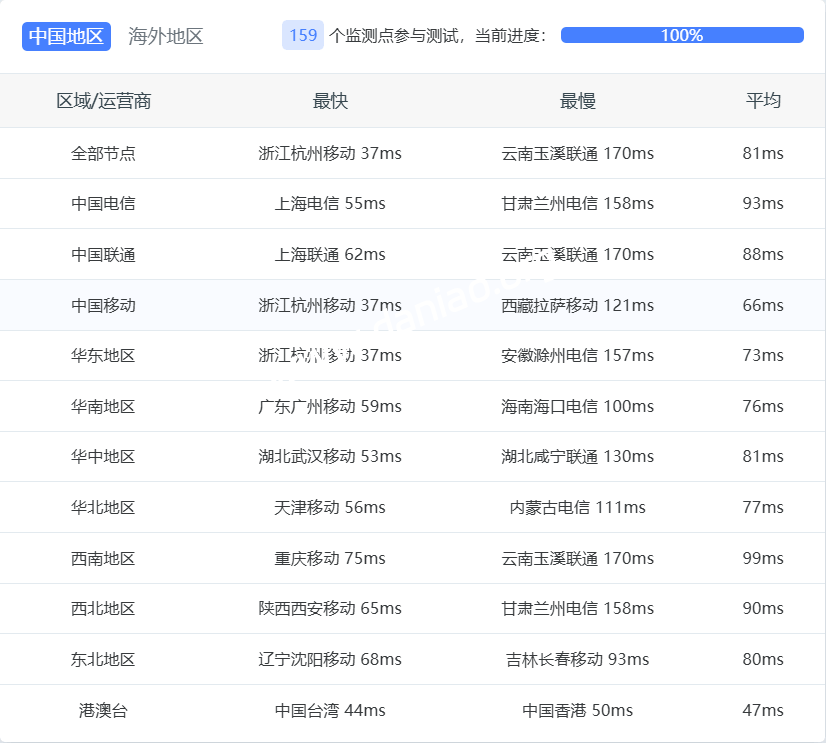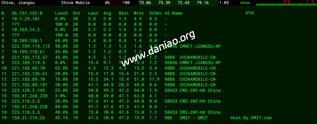 广东 电信 AS906 -> CMI 地理路径:gateway -> 上海 -> 广东 自治系统路径:AS906 -> AS58453 -> AS9808 -> AS4134 1 0.52ms 193.41.*.* AS906 [DMIT-BB] Anycast Anycast gateway DMIT.com 2 1.09ms 100.70.*.* * RFC6598 4-5 31.50ms 223.120.*.* AS58453 [CMI-INT] 中国 上海 cmi.chinamobile.com 移动 7 33.50ms 221.183.*.* AS9808 [CMNET] 中国 上海 I-C chinamobileltd.com 移动 9 87.82ms 221.183.*.* AS9808 [CMNET] 中国 广东 广州 chinamobileltd.com 移动 18 63.02ms 183.47.*.* AS4134 [APNIC-AP] 中国 广东省 广州市 chinatelecom.com.cn 电信 广东 联通 AS906 -> CMI 地理路径:gateway -> 日本 -> 上海 -> 广东 自治系统路径:AS906 -> AS58453 -> AS9808 -> AS17816 -> AS136958 1 0.71ms 193.41.*.* AS906 [DMIT-BB] Anycast Anycast gateway DMIT.com 2 0.58ms 100.70.*.* * RFC6598 4 1.28ms 223.118.*.* AS58453 [CMI-INT] 日本 东京都 东京 cmi.chinamobile.com 移动 5-7 33.93ms 221.183.*.* AS9808 [CMNET] 中国 上海 X-I chinamobileltd.com 移动 12 81.92ms 221.4.*.* AS17816 [UNICOM-GD] 中国 广东 广州 中国联通 联通 13 82.02ms 120.83.*.* AS17816 [APNIC-AP] 中国 广东 广州 中国联通 联通 18 80.86ms 157.148.*.* AS136958 [UNICOM-GD] 中国 广东省 广州市 chinaunicom.cn 联通 广东 移动 AS906 -> CMI 地理路径:gateway -> 广东 自治系统路径:AS906 -> AS58453 -> AS9808 -> AS56040 1 0.21ms 193.41.*.* AS906 [DMIT-BB] Anycast Anycast gateway DMIT.com 2 0.42ms 100.70.*.* * RFC6598 4 57.85ms 223.120.*.* AS58453 [CMI-INT] 中国 广东 广州 cmi.chinamobile.com 5-8 58.23ms 221.183.*.* AS9808 [CMNET] 中国 广东 广州 X-I chinamobileltd.com 移动 9 67.97ms 211.136.*.* AS56040 [CMNET] 中国 广东 广州 gd.10086.cn 移动 10-13 68.47ms 183.235.*.* AS56040 [APNIC-AP] 中国 广东 广州 gd.10086.cn 移动 15 74.08ms 211.139.*.* AS56040 [CMNET] 中国 广东 广州 gd.10086.cn 移动
