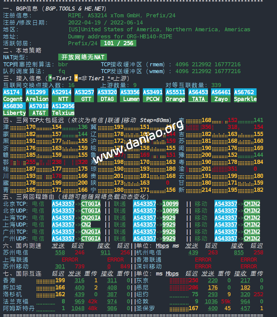 五、三网回程路由(线路可能随网络负载动态变化) 北京TCP:电信 AS43357->CTGGIA || 联通 AS43357->10099 || 移动 AS43357->CMIN2 北京UDP:电信 AS43357->CTGGIA || 联通 AS43357->10099 || 移动 AS43357->CMIN2 上海TCP:电信 AS43357->CN2GIA || 联通 AS43357->9929 || 移动 AS43357->CMIN2 上海UDP:电信 AS43357->CN2 || 联通 AS43357->9929 || 移动 AS43357->CMIN2 广州TCP:电信 AS43357->CN2GIA || 联通 AS43357->9929 || 移动 AS43357->CMIN2 广州UDP:电信 AS43357->CTGGIA || 联通 AS43357->9929 || 移动 AS43357->CMIN2