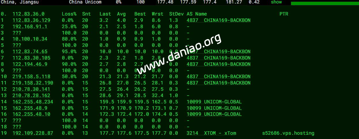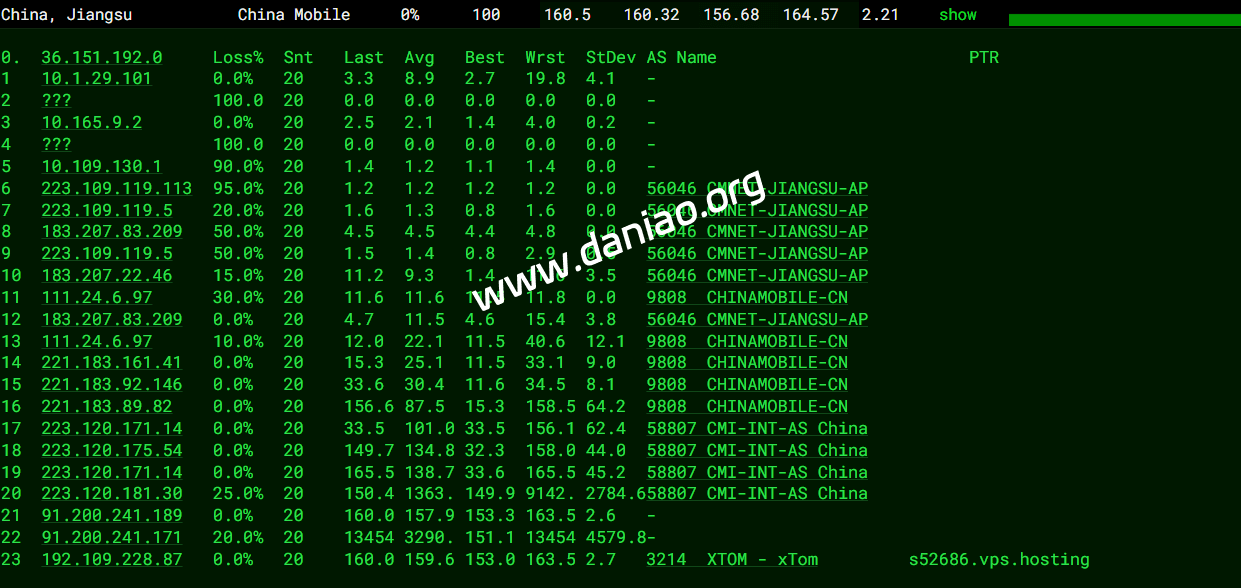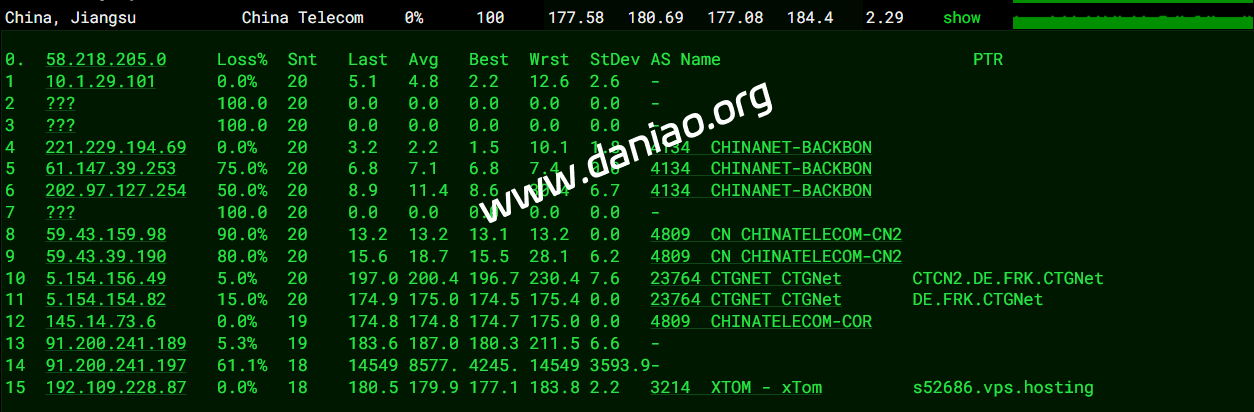 广东 电信 AS43357 -> CTGGIA 地理路径:荷兰 -> 德国 -> 北京 -> 上海 -> 广东 自治系统路径:AS43357 -> AS4809 -> AS23764 -> AS4809 -> AS4134 1 29.88ms 45.130.*.* AS43357 荷兰 北荷兰省 阿姆斯特丹 owl.net 2 0.50ms 91.200.*.* * 荷兰 北荷兰省 阿姆斯特丹 3 13.32ms 91.200.*.* * 德国 黑森 美因河畔法兰克福 4 7.18ms 145.14.*.* AS4809 [CTE-NET] 德国 黑森 美因河畔法兰克福 www.chinatelecom.com.cn 电信 5 6.82ms 5.154.*.* AS23764 * 德国 黑森 美因河畔法兰克福 电信/CTGNet 7 135.81ms 59.43.*.* AS4809 [CN2-BackBone] * 中国 北京 chinatelecom.cn 电信 8-9 173.16ms 59.43.*.* AS4809 [CN2-BackBone] * 中国 上海 chinatelecom.cn 电信 10 190.72ms 202.97.*.* AS4134 [CHINANET-BB] 中国 广东 广州 chinatelecom.com.cn 电信 11 182.12ms 219.128.*.* AS4134 [CHINANET-GD] 中国 广东省 汕头市 chinatelecom.com.cn 电信 17 178.77ms 183.47.*.* AS4134 [APNIC-AP] 中国 广东省 广州市 chinatelecom.com.cn 电信 广东 联通 AS43357 -> 9929 地理路径:荷兰 -> 英国 -> 德国 -> 北京 -> 广东 自治系统路径:AS43357 -> AS10099 -> AS9929 -> AS4837 -> AS17816 -> AS136958 1 4.53ms 45.130.*.* AS43357 荷兰 北荷兰省 阿姆斯特丹 owl.net 2 0.72ms 91.200.*.* * 荷兰 北荷兰省 阿姆斯特丹 3 6.13ms 91.200.*.* * 英国 英格兰 伦敦 4 7.90ms 162.255.*.* AS10099 [CUG-BACKBONE] 英国 英格兰 伦敦 chinaunicomglobal.com 联通 5-6 18.15ms 162.255.*.* AS10099 [CUG-BACKBONE] 德国 黑森 美因河畔法兰克福 chinaunicomglobal.com 联通 7 149.72ms 210.78.*.* [CNC-BACKBONE] * 中国 北京 chinaunicom.cn 联通 CUII 8 167.00ms 218.105.*.* AS9929 [CNC-BACKBONE] 中国 广东 广州 chinaunicom.cn 联通 CUII 9 167.99ms 210.14.*.* [CNC-BACKBONE] * 中国 广东 广州 11 182.39ms 219.158.*.* AS4837 [CU169-BACKBONE] 中国 广东 广州 chinaunicom.cn 12 173.00ms 112.89.*.* AS17816 [APNIC-AP] 中国 广东 广州 中国联通 联通 18 186.80ms 157.148.*.* AS136958 [UNICOM-GD] 中国 广东省 广州市 chinaunicom.cn 联通 广东 移动 AS43357 -> CMIN2 地理路径:荷兰 -> 德国 -> 北京 -> 广东 自治系统路径:AS43357 -> AS58807 -> AS9808 -> AS56040 1 0.72ms 45.130.*.* AS43357 荷兰 北荷兰省 阿姆斯特丹 owl.net 2 0.56ms 91.200.*.* * 荷兰 北荷兰省 阿姆斯特丹 3 10.45ms 91.200.*.* * 德国 黑森 美因河畔法兰克福 4-5 15.62ms 223.120.*.* AS58807 [CMIN2-NET] 德国 黑森州 美因河畔法兰克福 cmi.chinamobile.com 移动 6 131.17ms 223.120.*.* AS58807 [CMIN2-NET] 中国 北京 法兰克福-北京 cmi.chinamobile.com 移动 7-9 134.79ms 221.183.*.* AS9808 [CMNET] 中国 北京 X-I chinamobileltd.com 移动 10-11 161.33ms 111.24.*.* AS9808 [CMNET] 中国 广东 广州 chinamobileltd.com 移动 12 187.76ms 211.136.*.* AS56040 [CMNET] 中国 广东 广州 gd.10086.cn 移动 13-15 186.83ms 120.198.*.* AS56040 [APNIC-AP] 中国 广东 广州 gd.10086.cn 移动 18 180.18ms 211.139.*.* AS56040 [CMNET] 中国 广东 广州 gd.10086.cn 移动